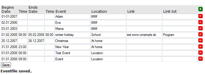 Your Eventfile can be edited either by the Plugin manager og by a CMSimple page.